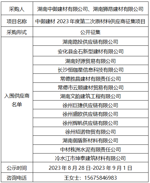 特別說明:請(qǐng)以上入圍供應(yīng)商單位在公示之日起到2023年9月3日17時(shí)止至湖南中御建材有限公司進(jìn)行二次商談,若未在規(guī)定時(shí)間內(nèi)進(jìn)行商談的則視為自動(dòng)放棄入圍,將取消入圍資格。
